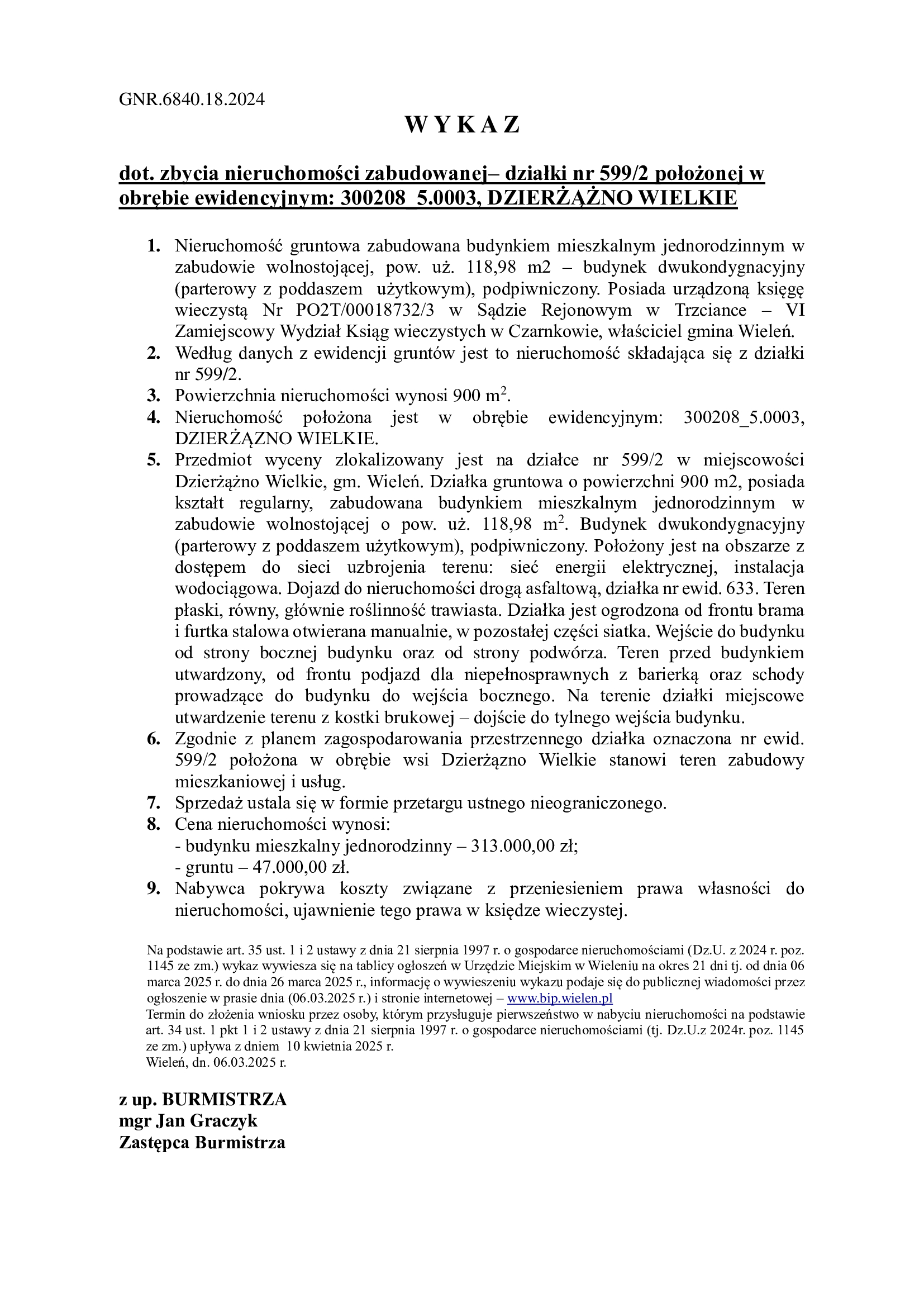 dot. zbycia nieruchomości zabudowanej– działki nr 599/2 położonej w obrębie ewidencyjnym: 300208_5.0003, DZIERŻĄŻNO WIELKIE