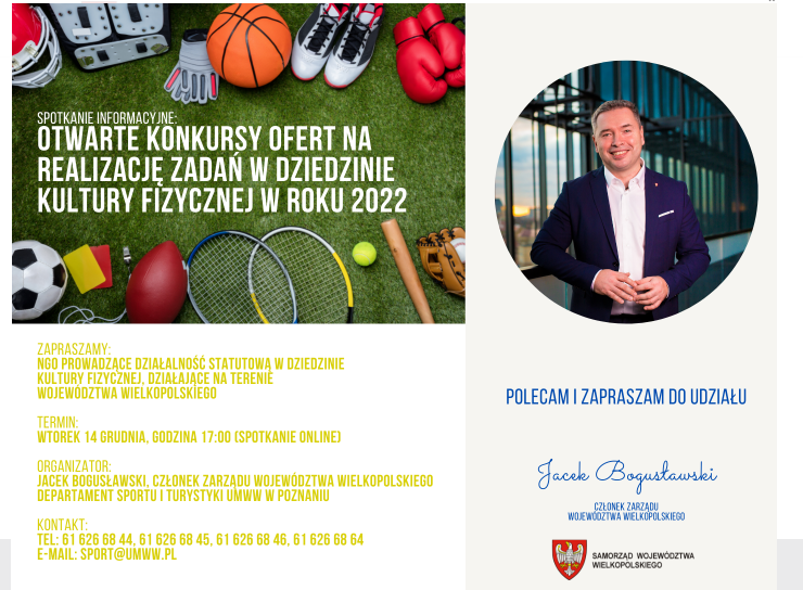 Serdecznie zapraszam na spotkanie informacyjne, którego tematem będą otwarte konkursy ofert na realizację zadań publicznych Województwa Wielkopolskiego w dziedzinie kultury fizycznej w roku 2022.